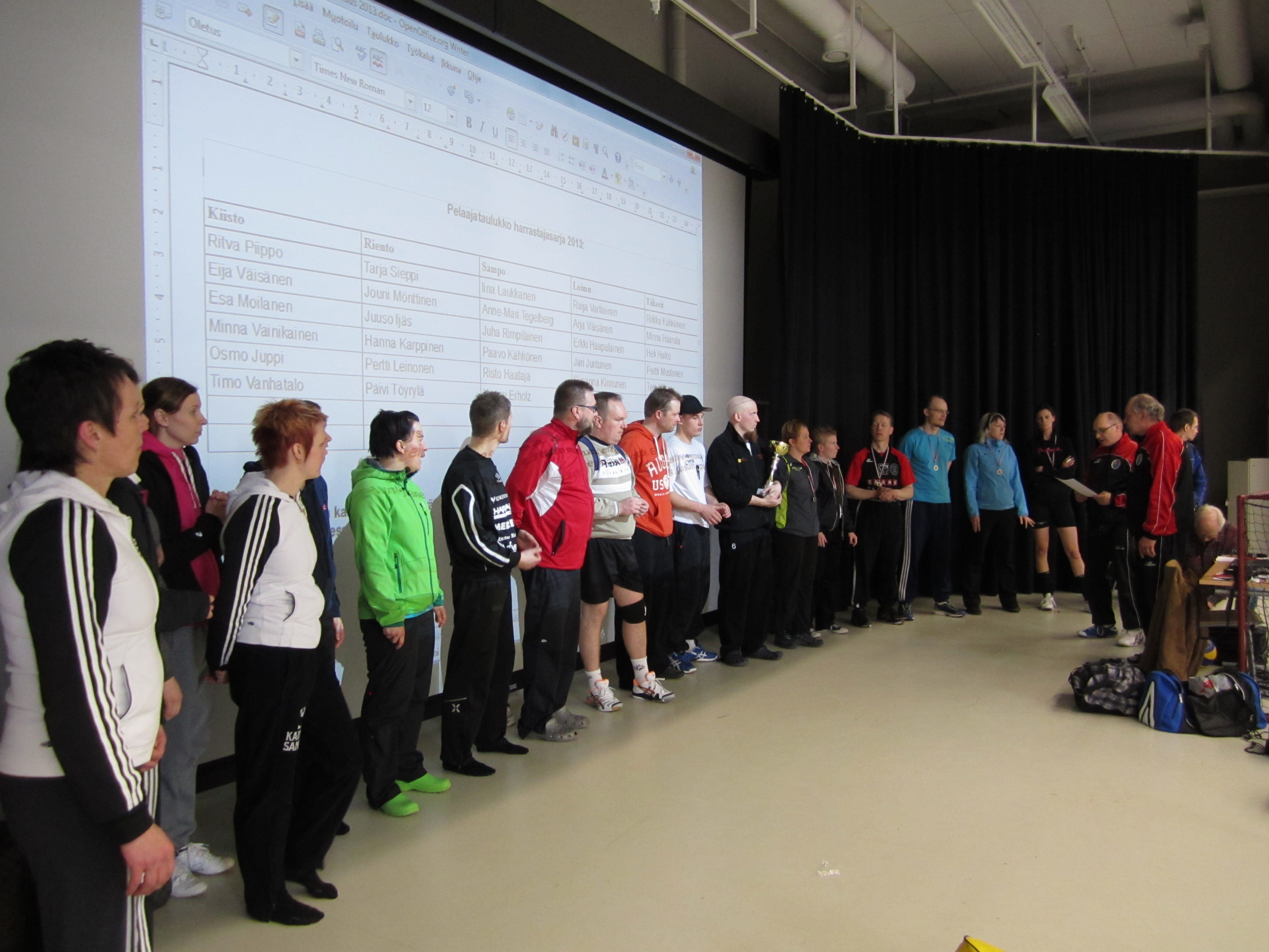 Kajaanin Ammattiopiston sali oli viime lauantaina täynnä pallon pauketta ja sporttisen näköistä porukkaa. Vielä viime hetkillä miesten sarjaan tuli osanottajamuutoksia, joten pelit eivät päässeet siltä osin alkamaan ihan aikataulussa, mutta se ei menoa haitannut. Pelit kulkivat sopivalla tahdilla koko päivän, taukoja unohtamatta. Jokainen joukkue sai vuorotellen toimia tuomarin ja kirjurin roolissa.